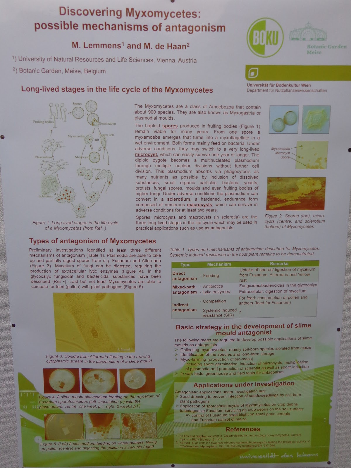 Myxomycetes were collected from maize plants in 2015 and 2016 at the end of the growth season. Five different species including soil-borne Physarum and Didymium spp. were identified. It was demonstrated that slime moulds can have at least 3 different known types of antagonism: